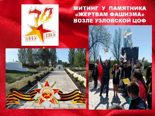 7 мая 2015 года учащиеся 5-11 классов приняли участие в митинге-реквиеме возле памятника "Жертвам фашизма". Мы пришли на это памятное место для того, чтобы не притупилась наша память, чтобы всегда у нас хватало мудрости, воспитания и почтения к своим героическим предкам. Ветераны войны, дети - войны, учащиеся, педагоги, жители поселка "Румянцева" почтили светлую память всех погибших в шурфе шахты "Узловая №7" минутой молчания и возложили цветы к месту их гибели.