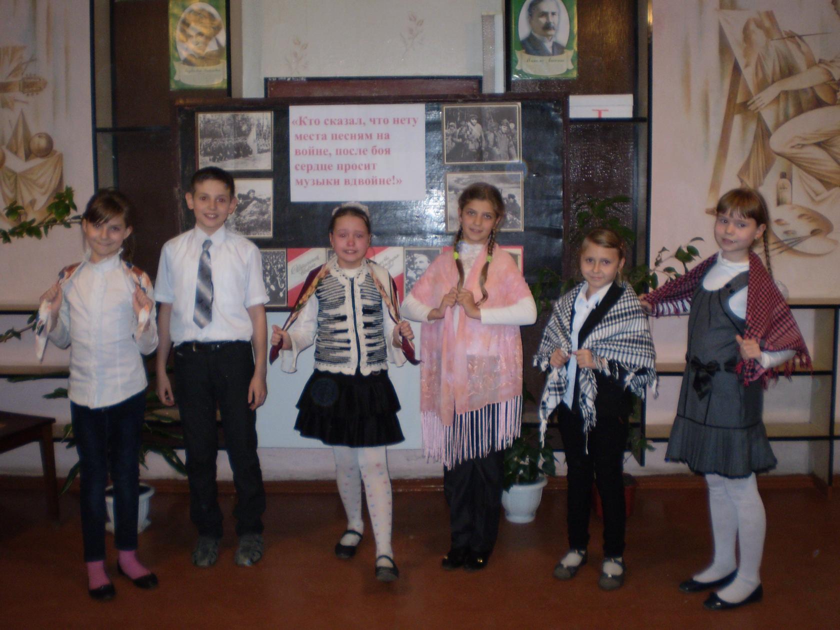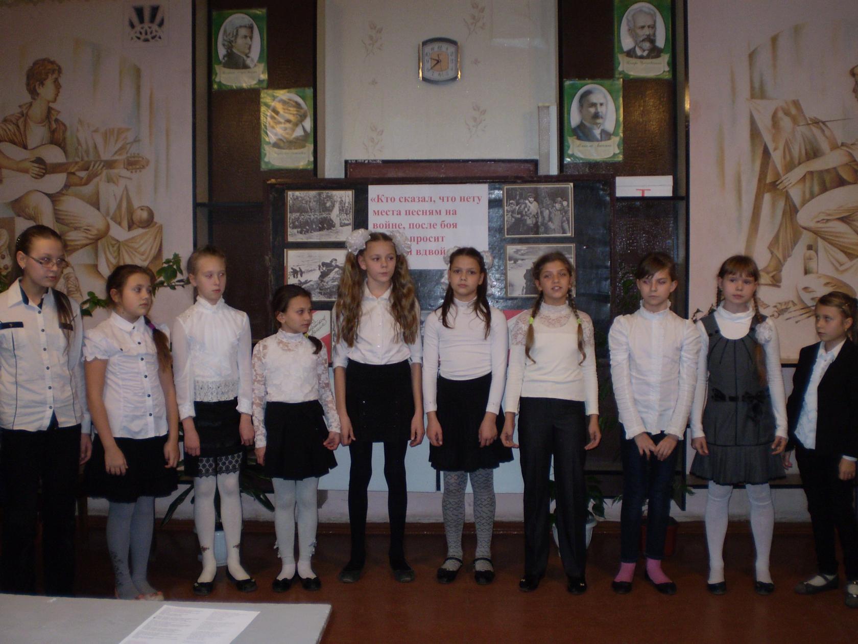 12.11. в школе прошло открытое внеклассное мероприятие на тему: "Кто сказал, что нету места песням на войне, после боя сердце просит музыки вдвойне!" для 5-6 классов. В своих выступлениях